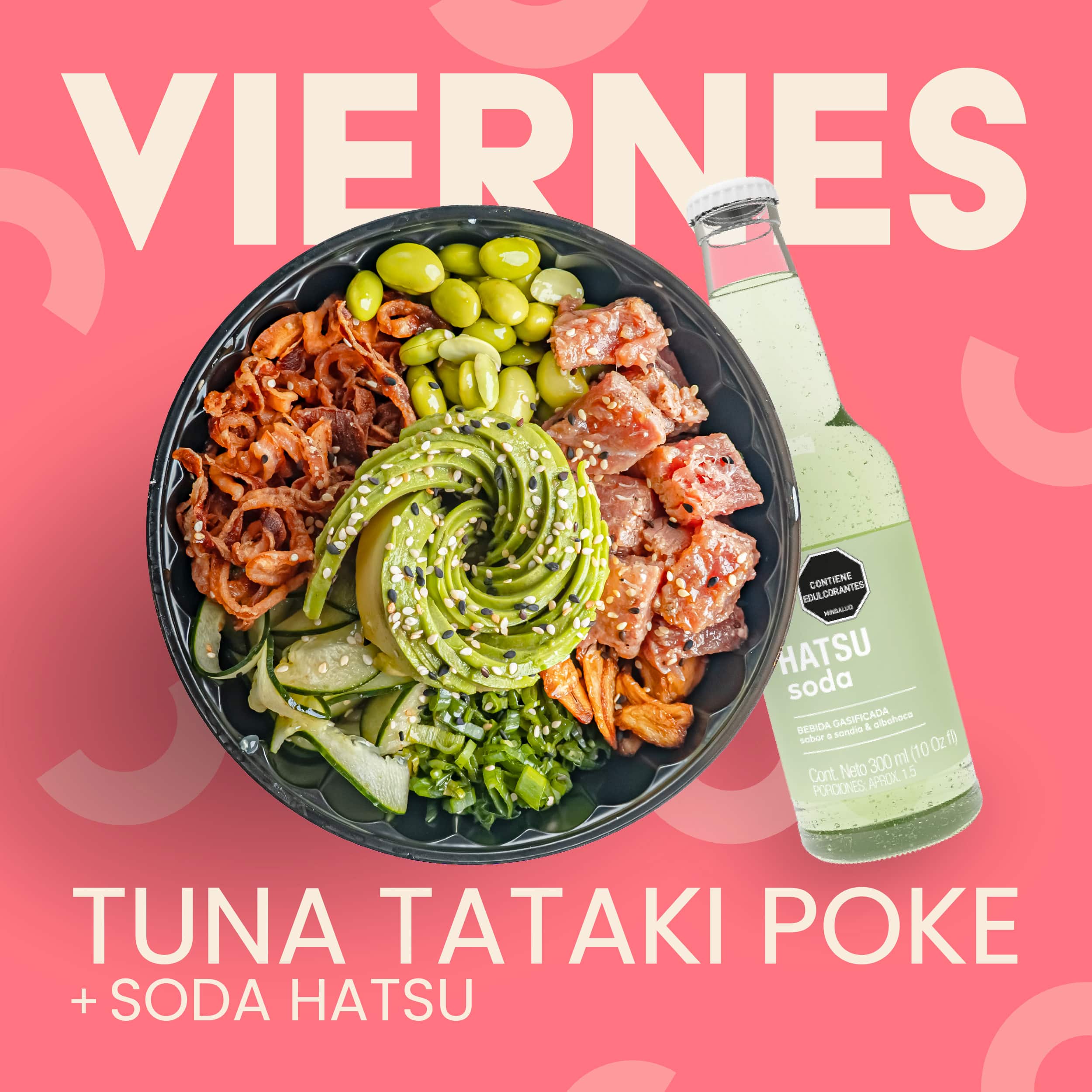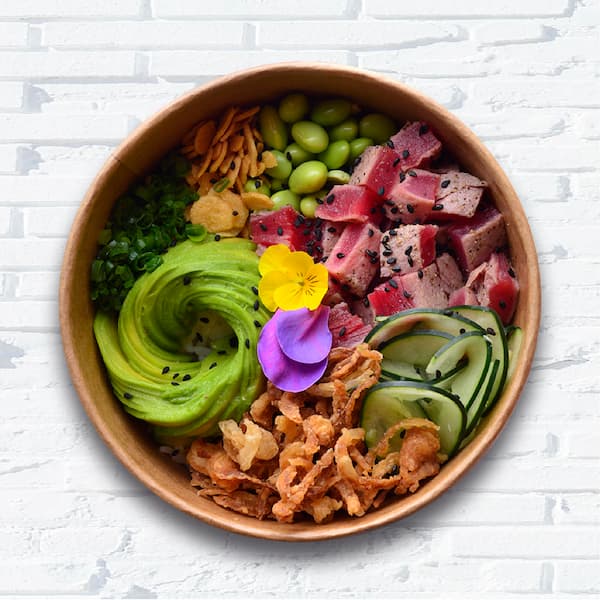Atún sellado, arroz de sushi, edamame, aguacate, chips de ajo, pepino, cebollín, cebolla crispy, ajonjolí, salsa spicy lemon.