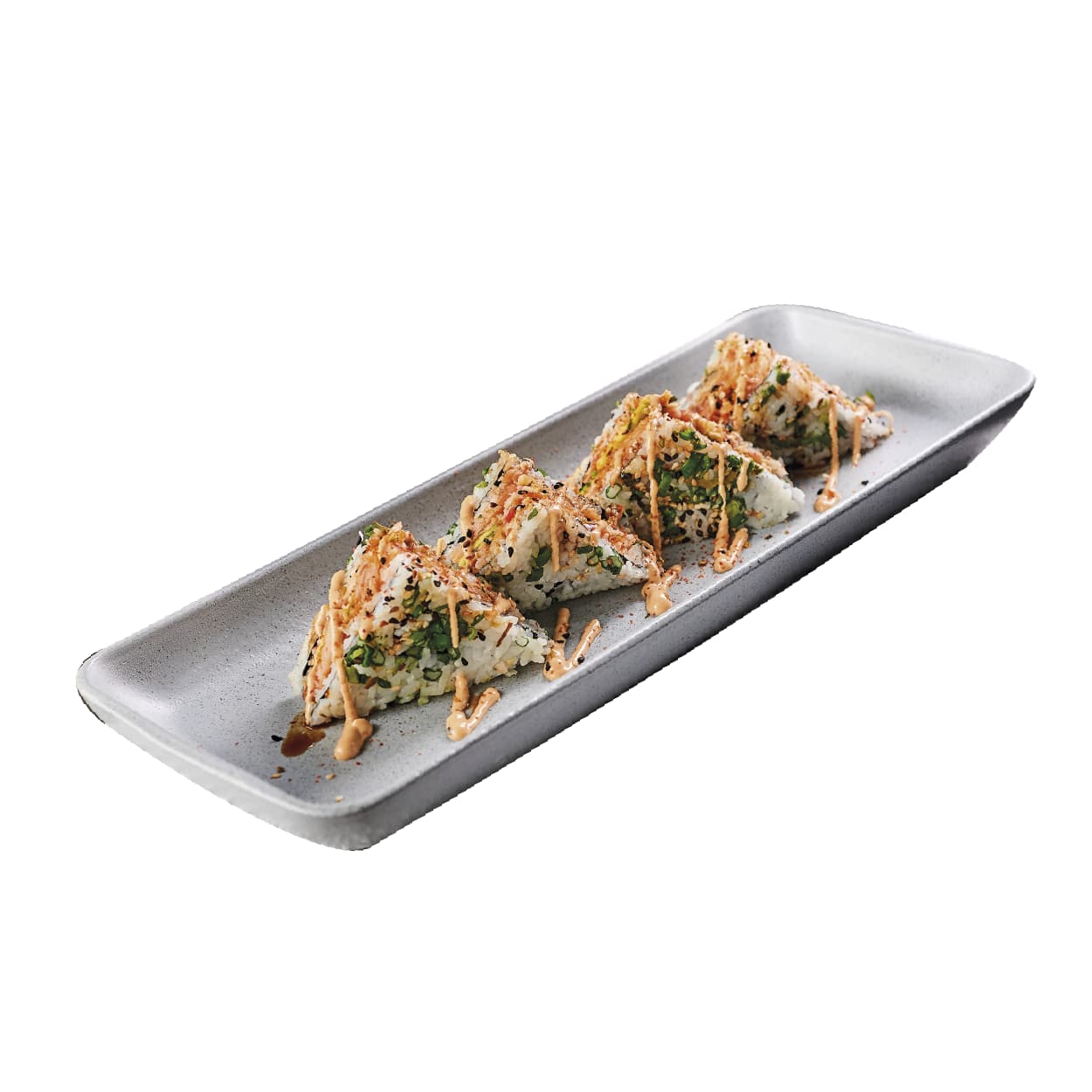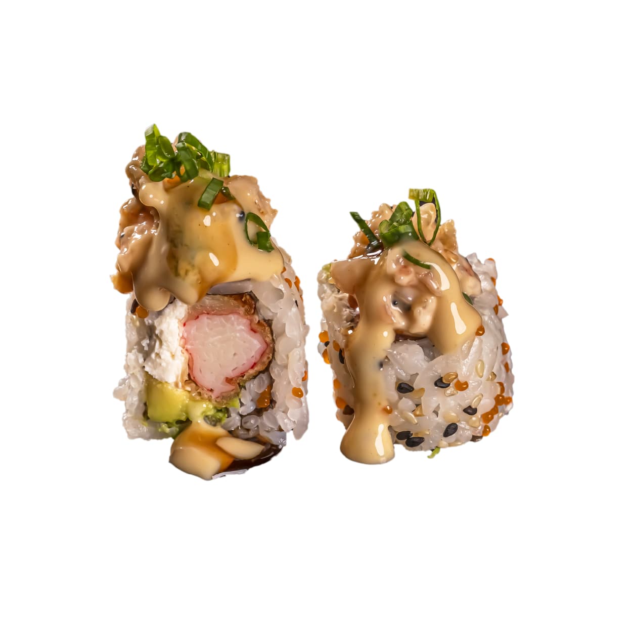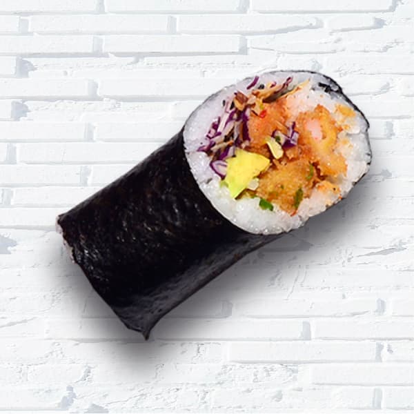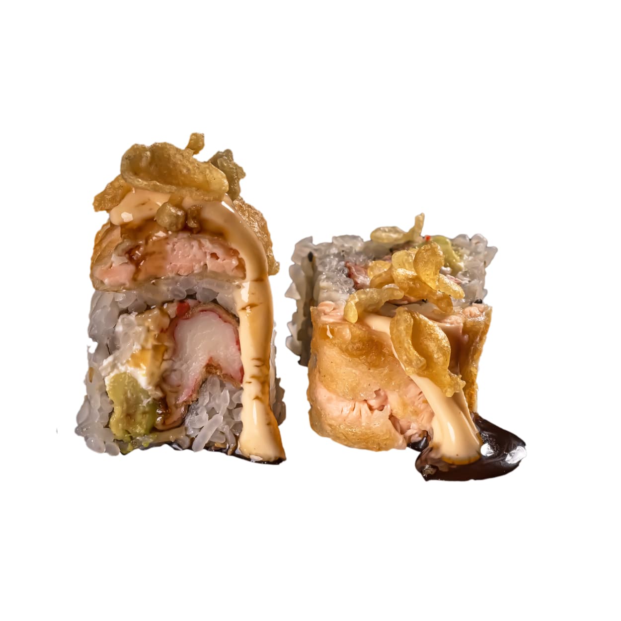 Sushi de kanikama apanado, spicy crab salad, hojuelas tempura, salmón tempura, aguacate y salsa de anguila.