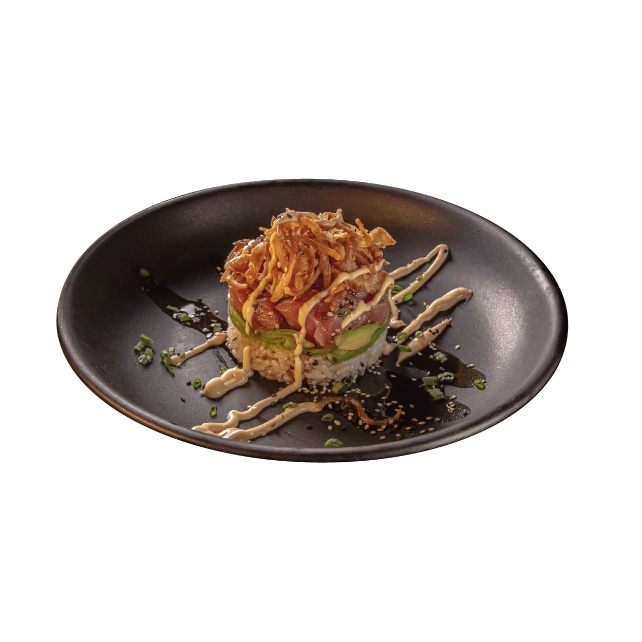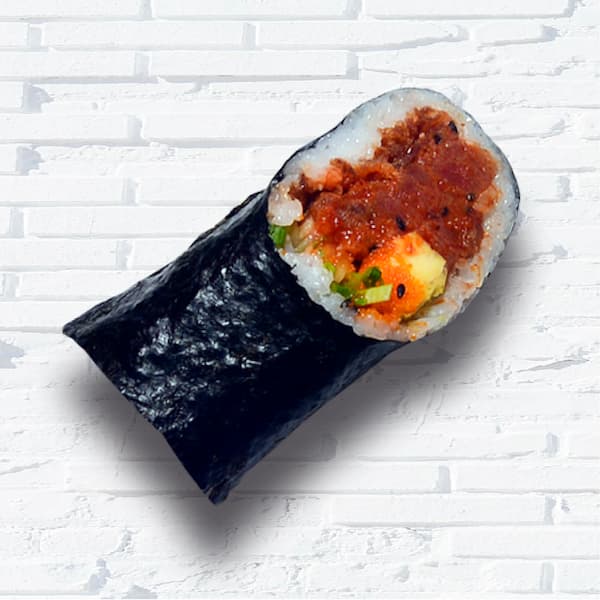 Atún, arroz de sushi, aguacate, pepino, cebollín, cebolla crispy, ajonjolí. Salsa spicy mayo, salsa anguila y salsa tuna mix aparte.