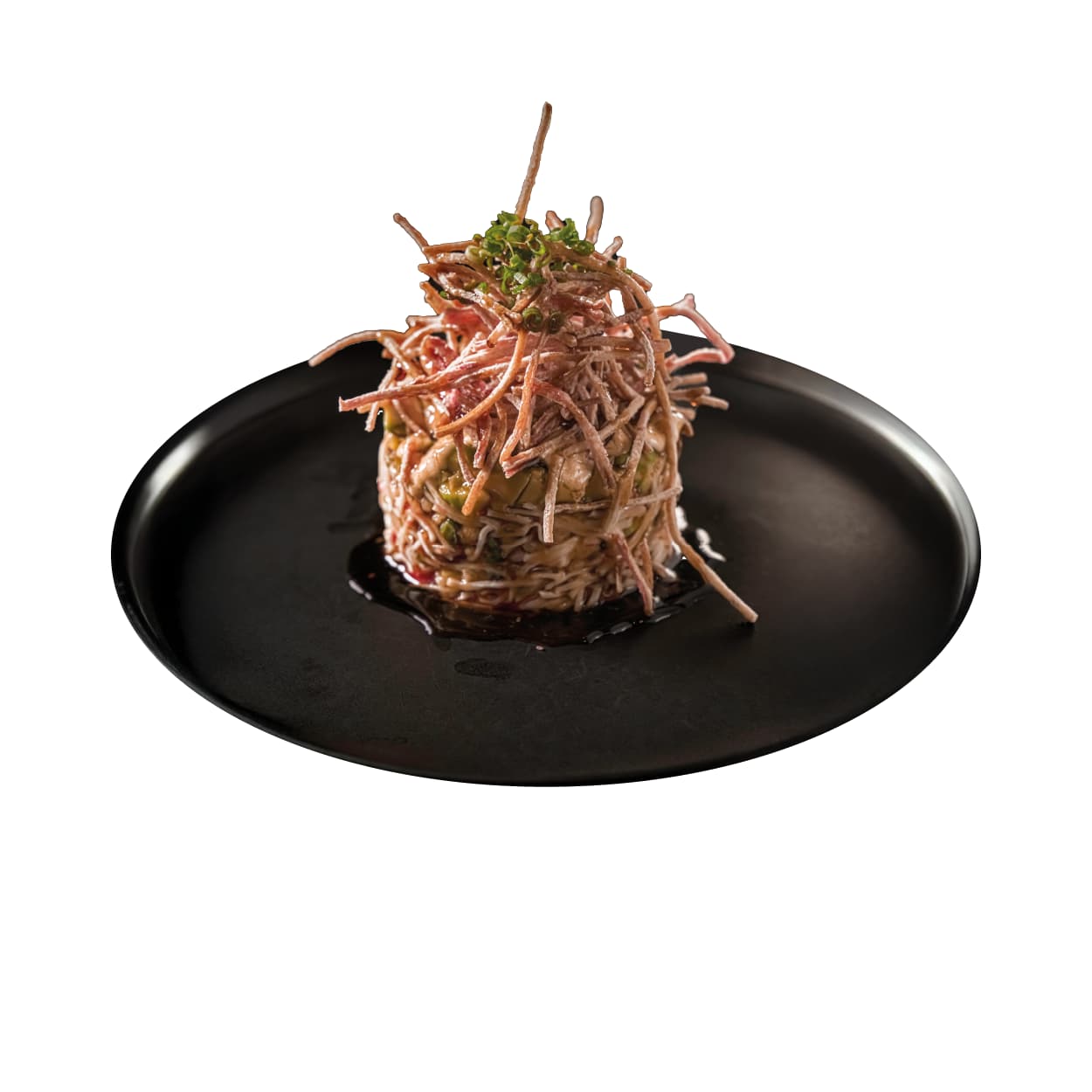 Ensalada de palmito de cangrejo con spicy mayo, hojuelas tempura, aguacate, salsa de anguila, kanikama crujiente, cebolla y mix de ajonjolí.