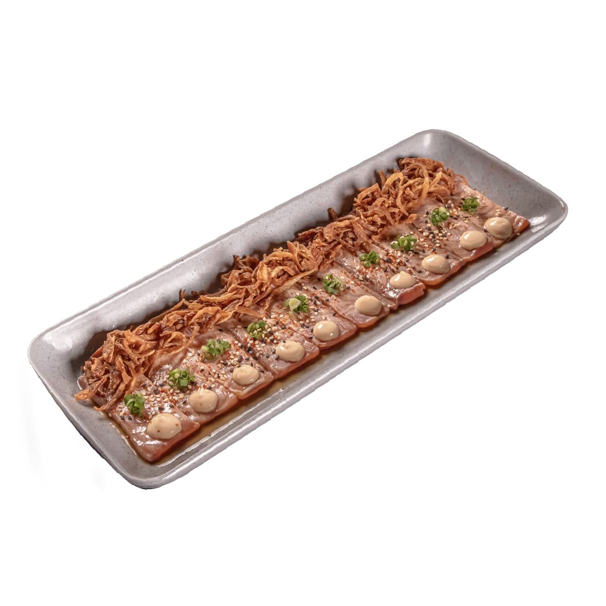 Salmón, cebollin chino, ajonjolí, cebolla crispy, togarashi, mantequilla cítrica y mayonesa de trufa.